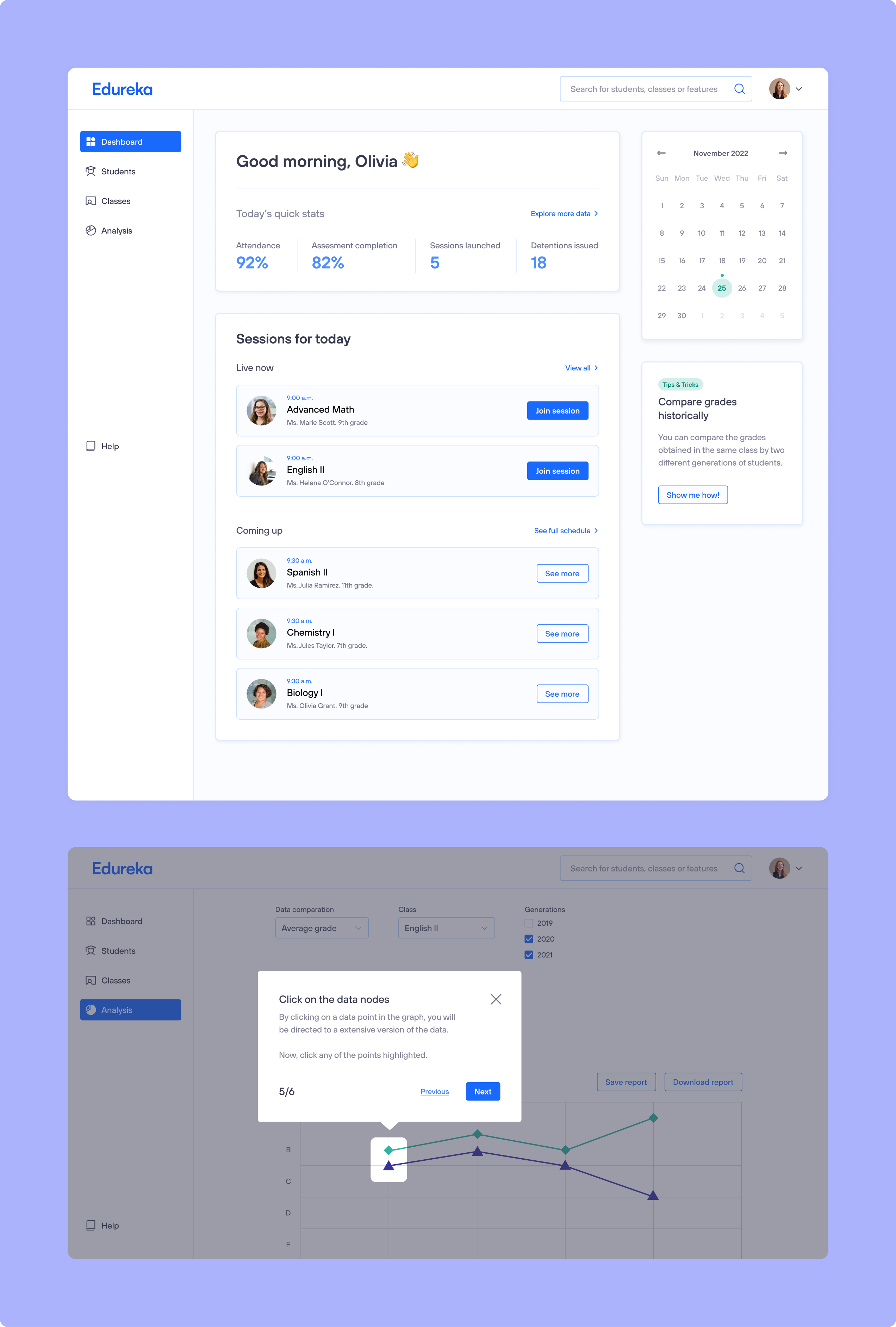 Edureka is a web platform design concept that aims to solve the needs expressed by our target user base. It acts as a hub for all the information regarding the school. A one-stop shop for administrators to monitor classes and student performance based on data.